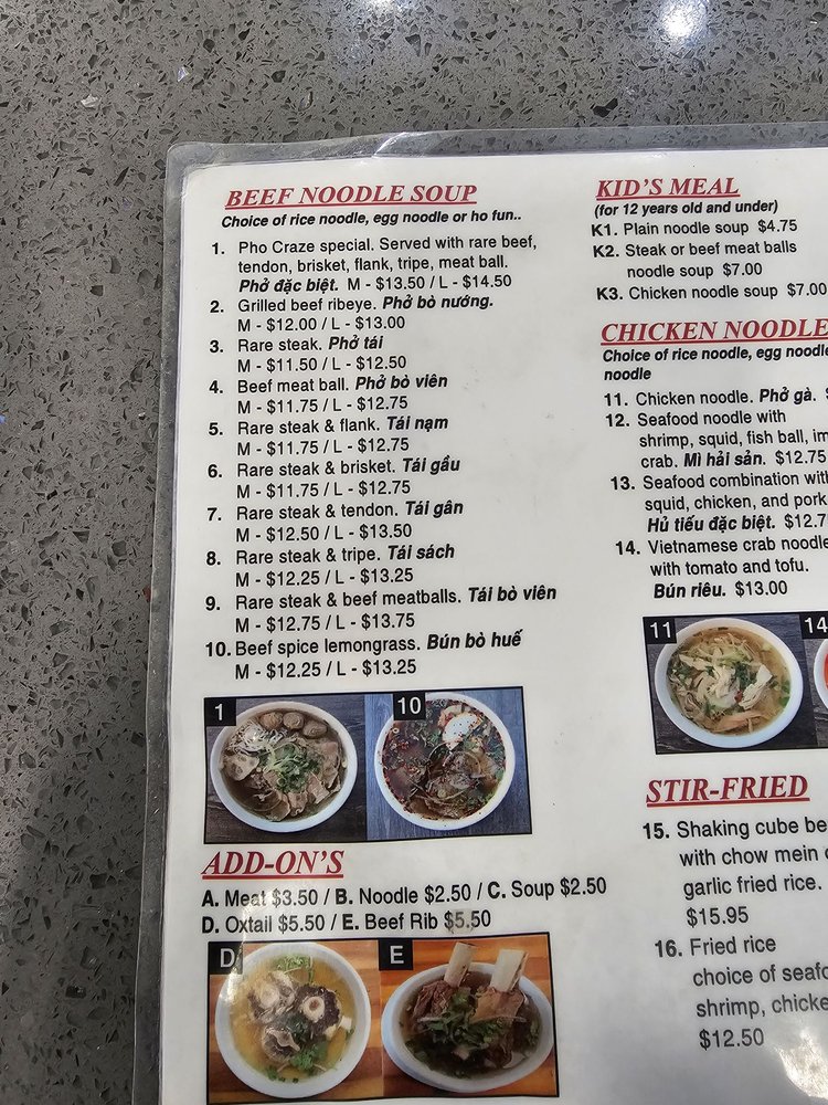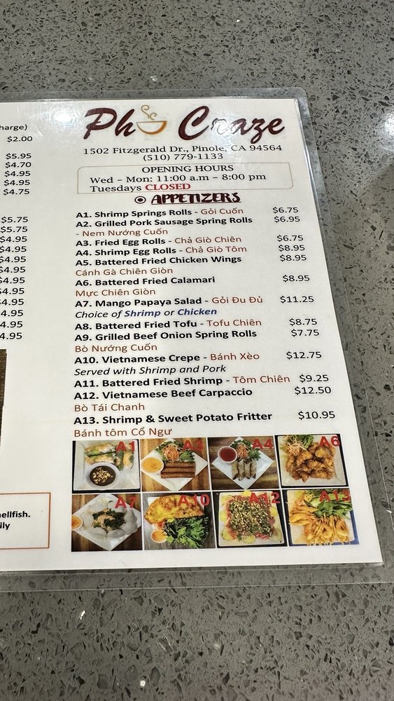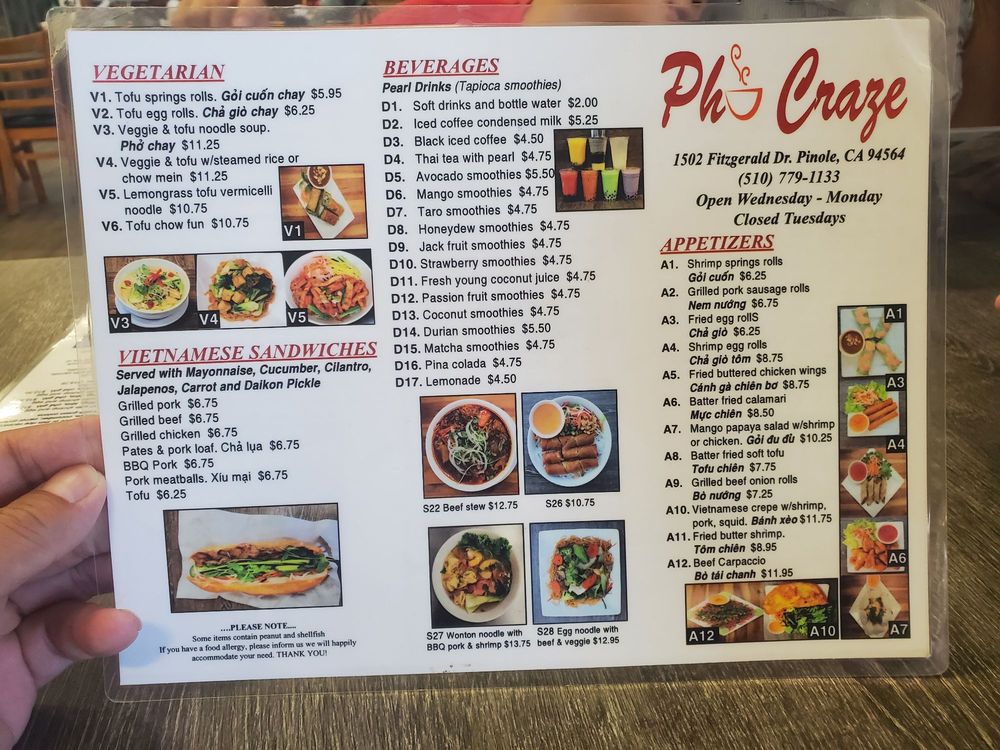 Pho Craze, a Vietnamese restaurant located in Pinole, CA, offers a wide array of delectable dishes with vegan and vegetarian options. From shrimp spring rolls to grilled beef ribeye noodle soup, the menu caters to various preferences. Customer reviews praise the generous portions of meats and noodles in their pho dishes. The friendly service and quick, flavorful meals make dining at Pho Craze a delightful experience. With accessible parking, takeout options, and gender-neutral restrooms, the restaurant ensures inclusivity for all patrons. Whether you're craving a comforting bowl of pho on a chilly day or looking to explore Vietnamese cuisine, Pho Craze is a must-visit spot for food enthusiasts.